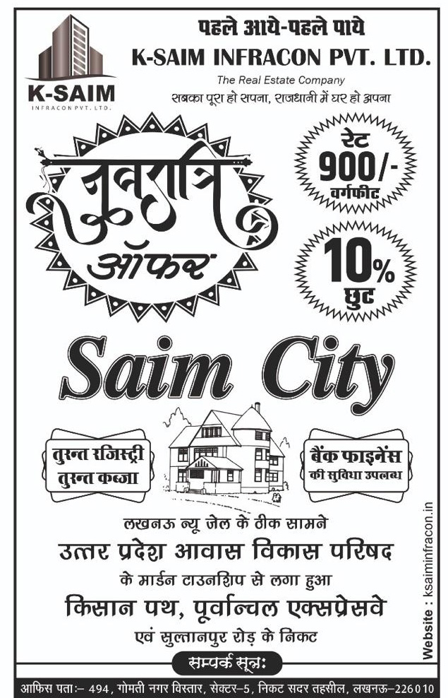 SAIM CITY at Infront of New Jail, NH-56B, Lucknow which is a union of Indian - enthusiastic, innovative, trustworthy & experienced team of professionals based in Lucknow. We serves our country-men through smart investment technique and as construction consultant. Our motive is to provide real plateform to common citizen which may invest smartly with our innovative ideas and creativity. We wish to be integrated part of new nation-building by our civil & architectural engineering skills..!