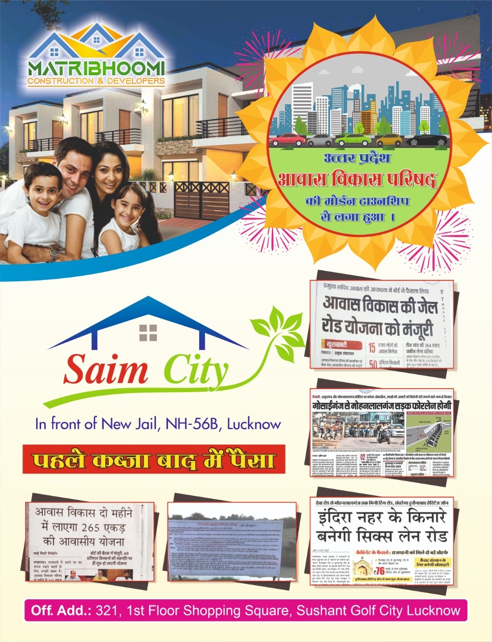SAIM CITY at Infront of New Jail, NH-56B, Lucknow which is a union of Indian - enthusiastic, innovative, trustworthy & experienced team of professionals based in Lucknow. We serves our country-men through smart investment technique and as construction consultant. Our motive is to provide real plateform to common citizen which may invest smartly with our innovative ideas and creativity. We wish to be integrated part of new nation-building by our civil & architectural engineering skills..!